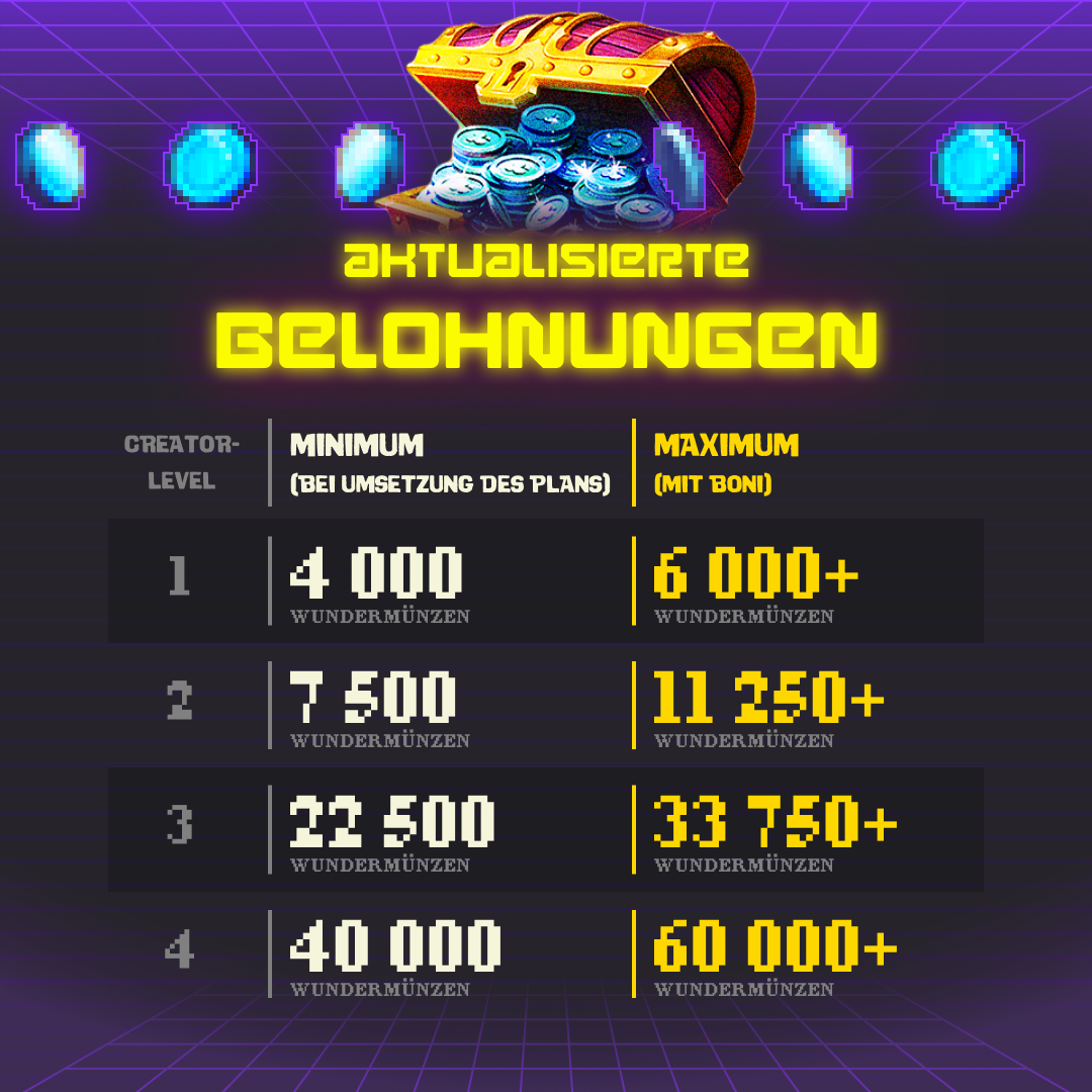 Die Teilnahmebedingungen für Content-Creator wurden klarer definiert, und das Belohnungssystem wurde modernisiert, um eure Kreativität, euren Aufwand und euer Engagement noch besser zu honorieren. Eine Übersicht der wichtigsten Neuerungen findet ihr in den Info-Karten unten.